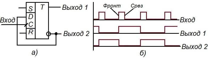 Рис. 18 – Работа D-триггера в счетном режимеа) – соединение выводов, б) – временные диаграммы