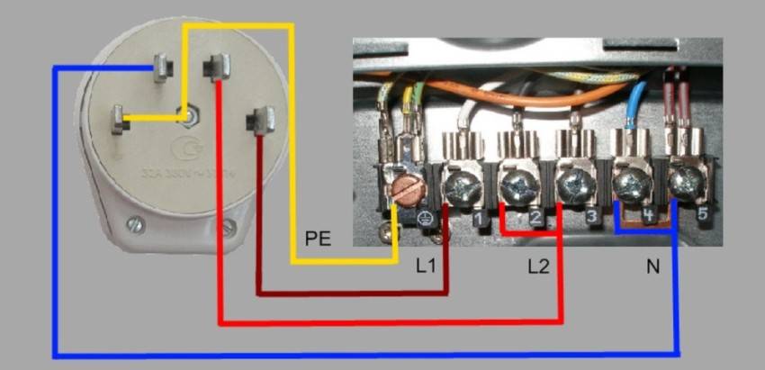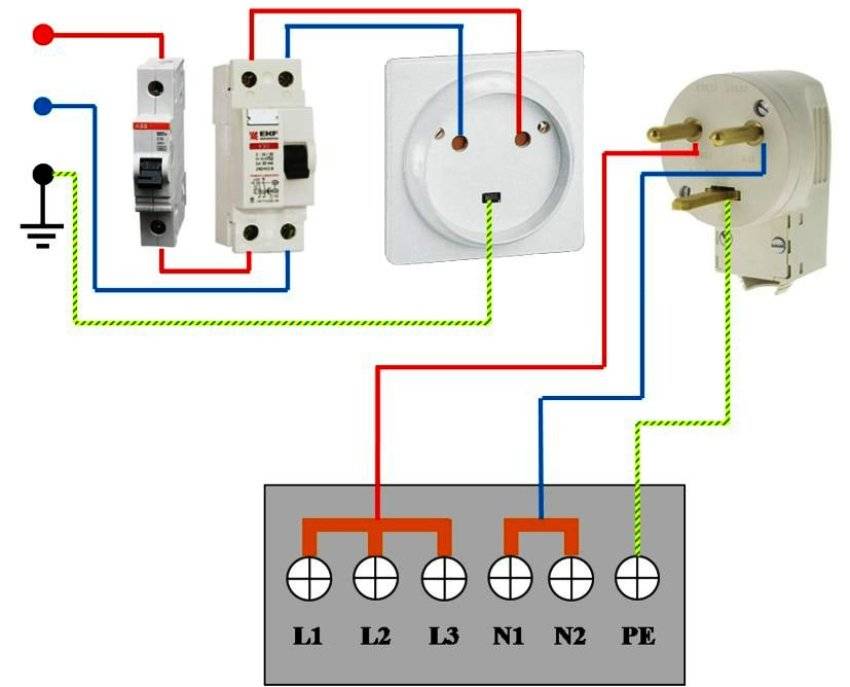 При трехфазной сети нейтраль (ноль) подключается вверху, а земля, наоборот, снизу. В свою очередь, провода, обозначающие фазы, располагаются посередине. На розетке также необходимо соблюдать этот порядок.
