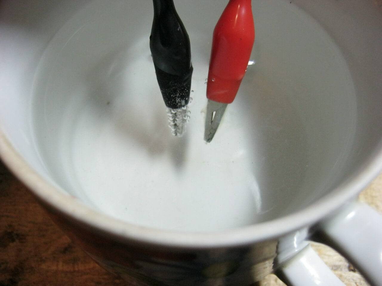 По похожей методике можно определить полярность контактов в цепи постоянного тока. Для этого два провода опускаются в чашку с водой и если возле одного из них начинают образовываться пузыри, как показано на фото ниже, значит, это минус и, соответственно, вторая жила – плюс.