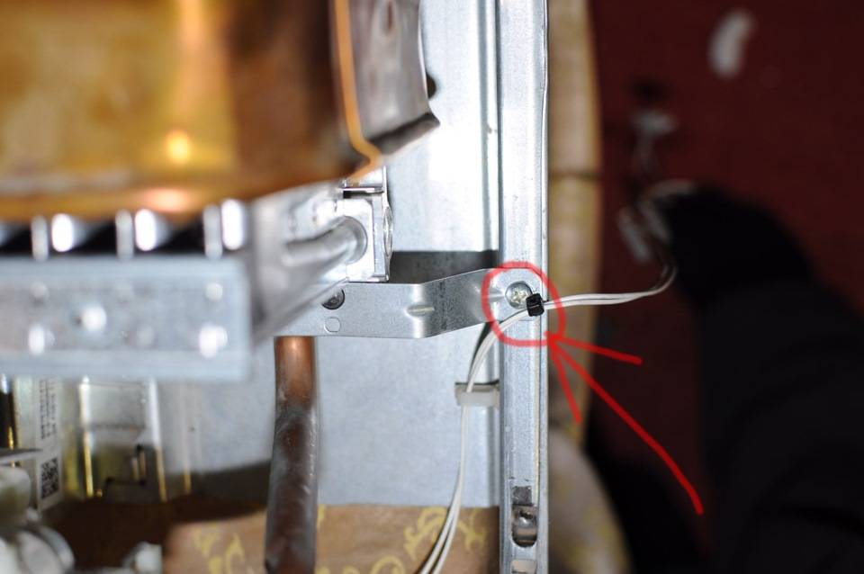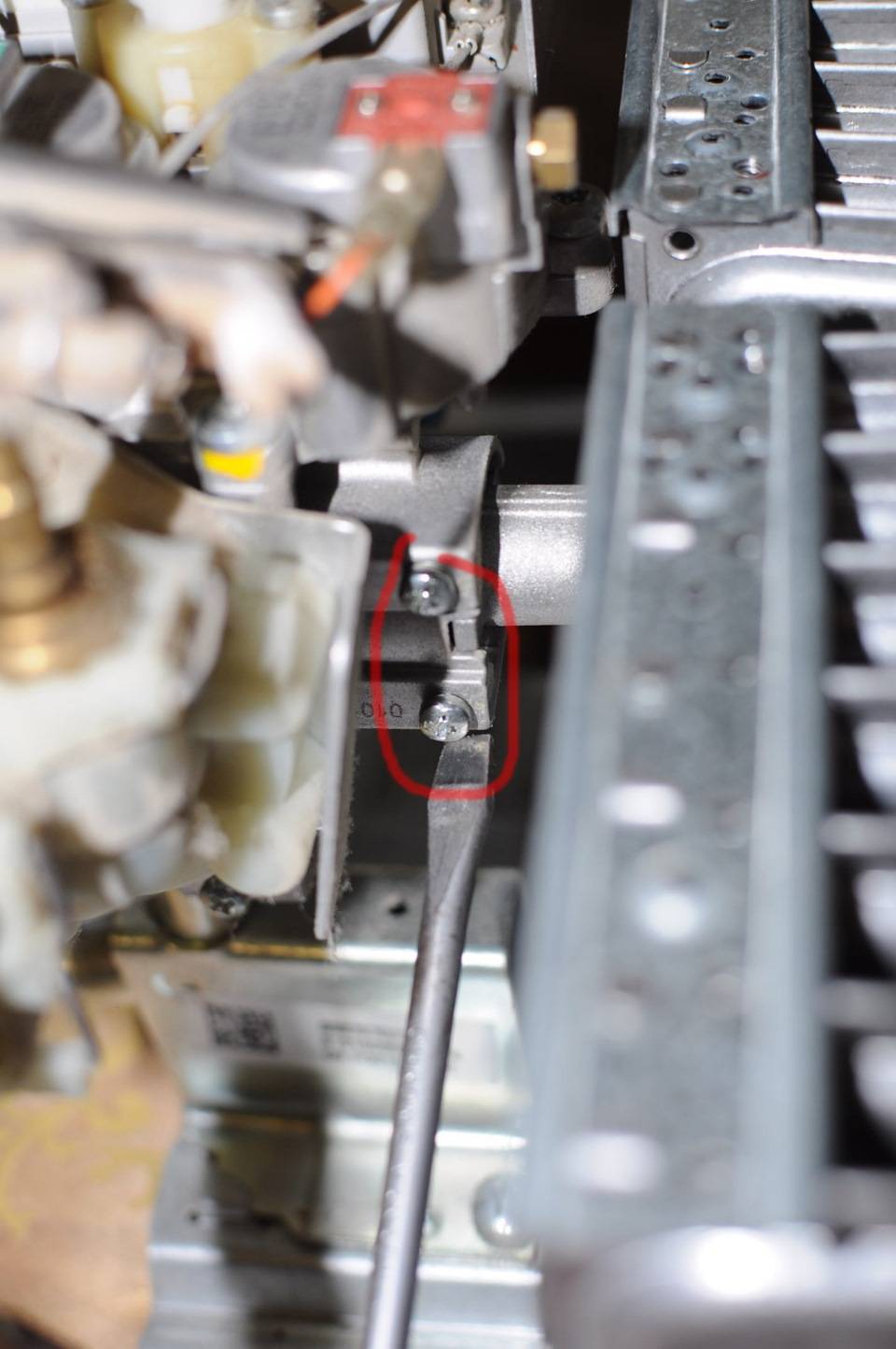 - Верхний конец. Нужно вытянуть вверх скобу, удерживающую развальцованный край запальной трубки на торце горелки. Слегка разожмите скобу, затем сместите вверх плоскогубцами-утконосами или подденьте отверткой до полного извлечения;