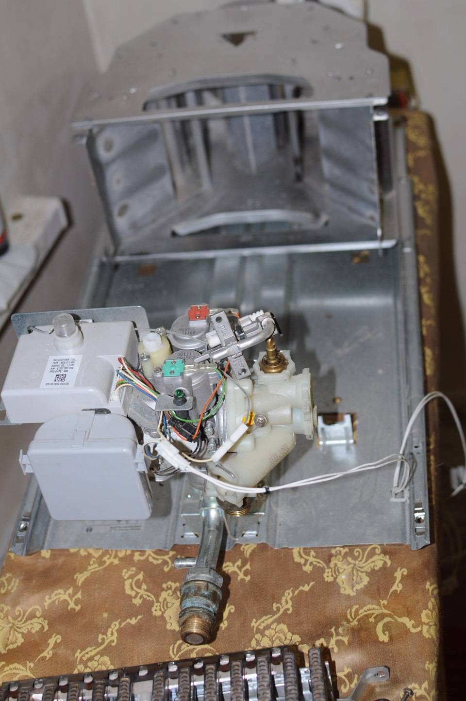 - Разобрать другие элементы, детали, которые мешают легко выполнить демонтаж. Их количество зависит от конкретной модели, конструктивных особенностей колонки. В некоторых случаях нужно убрать дымоотводный диффузор, в других – группу для розжига, в третьих – датчики перегрева, тяги. Возможно, придется снимать все детали.