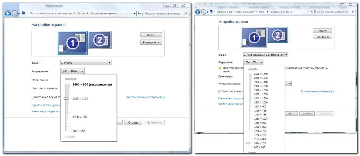 - Выбрать необходимый экран и выбрать необходимое разрешение для корректного вывода изображения.