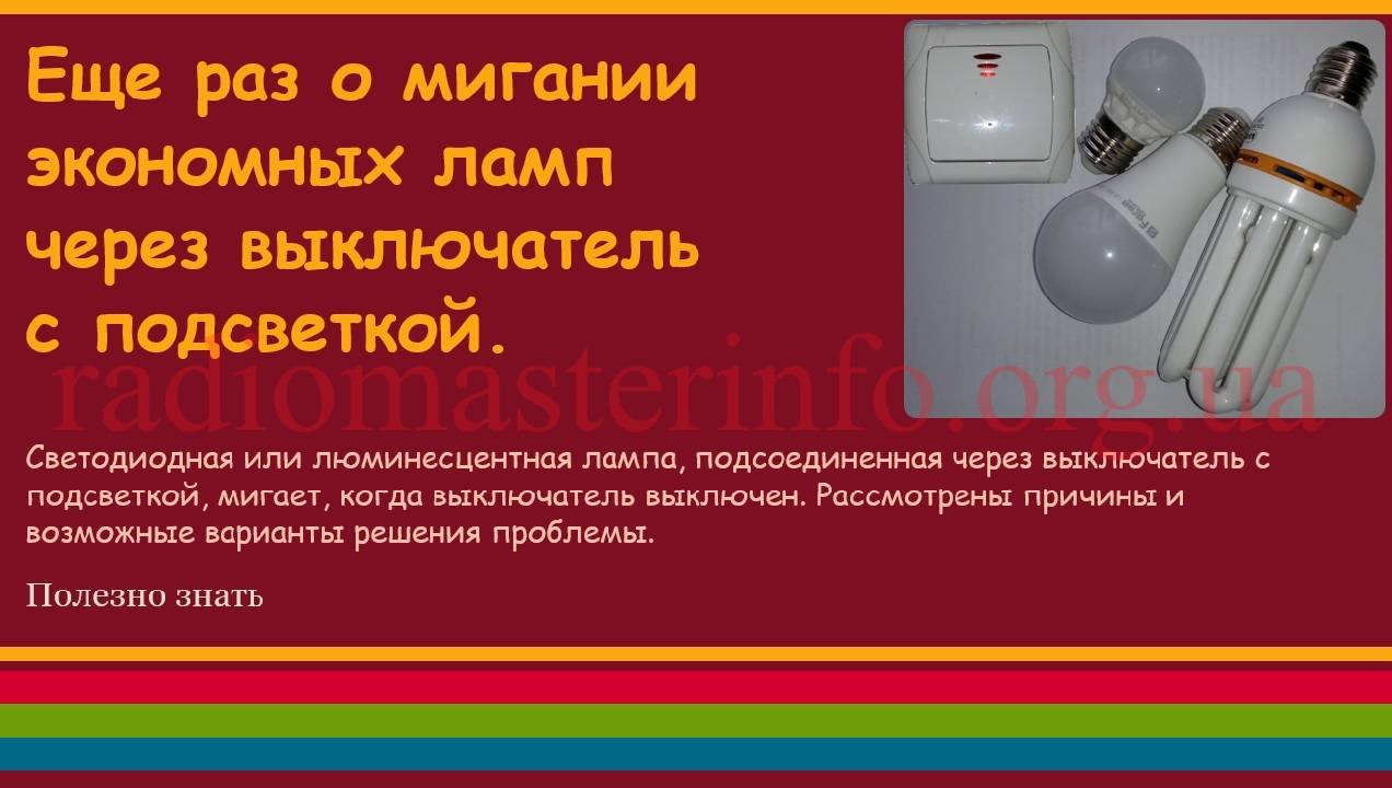 Есть еще проблемы мигания экономных ламп, включаемых даже не через выключатель с подсветкой, а через обычный выключатель. Но они, как правило следующие: