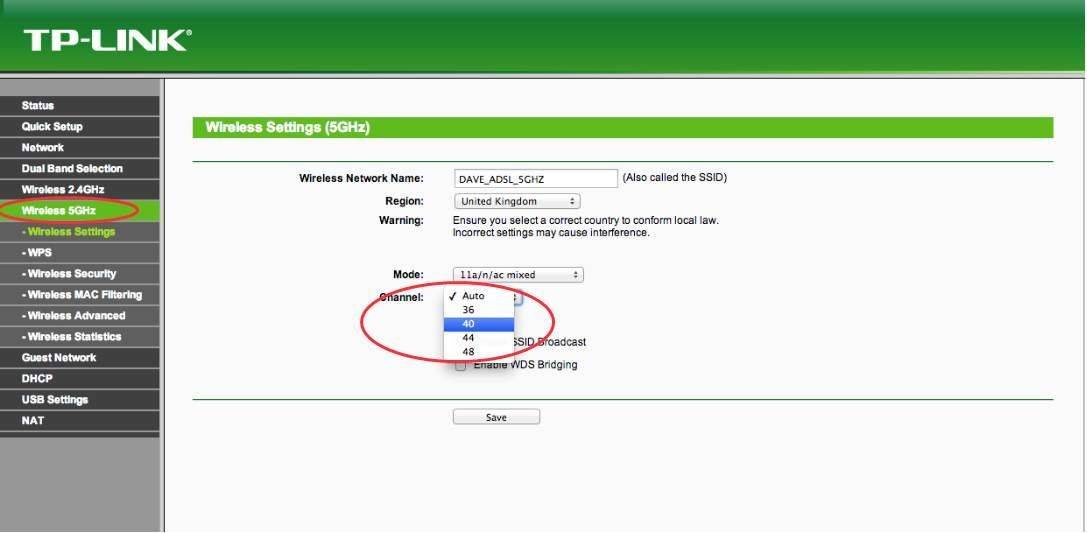 4) Перейти к Беспроводной и нажмите Беспроводная связь 2,4 ГГц или же Беспроводная связь 5 ГГц , и изменить канал в менее многолюдный.