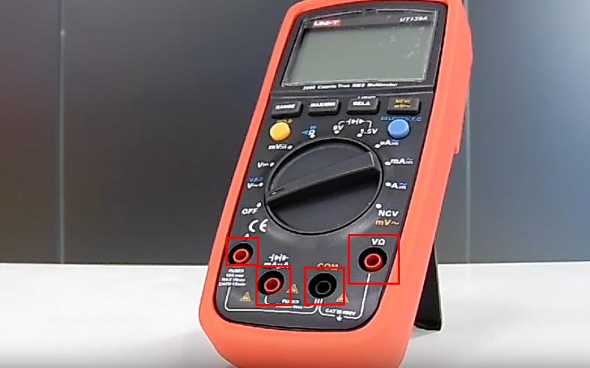 Ниже на корпусе имеются гнезда для подключения щупов. В зависимости от модели гнезд бывает два или три, щупов всегда два. Один положительный (красного цвета), второй отрицательный — черного. Черный щуп всегда подключается к разъему, подписанному «COM» или COMMON или который имеет обозначение как «земля». Красный — в одно из свободных гнезд. Если разъемов всегда два, проблем не возникает, если гнезд три, надо в инструкции прочесть, при каких измерениях в какое гнездо вставлять «плюсовой» щуп. В большинстве случаев красный щуп подключают в среднее гнездо. Так проводится большая часть измерений. Верхний разъем необходим, если измерять собрались ток до 10 А (если больше, то тоже в среднее гнездо).