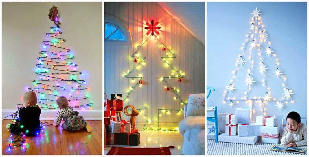 Идей для украшения стены множество, но чаще всего на них выполняют композицию в виде елки. На поверхности намечаются места, на которые будут монтироваться крепления. Установленные крючки должны смотреть налево и направо с каждой стороны соответственно. Начиная сверху, за крючки зацепляется гирлянда в форме елки. Траектория прохождения гирлянды может быть разной: зигзагообразной или в виде треугольников разного размера.