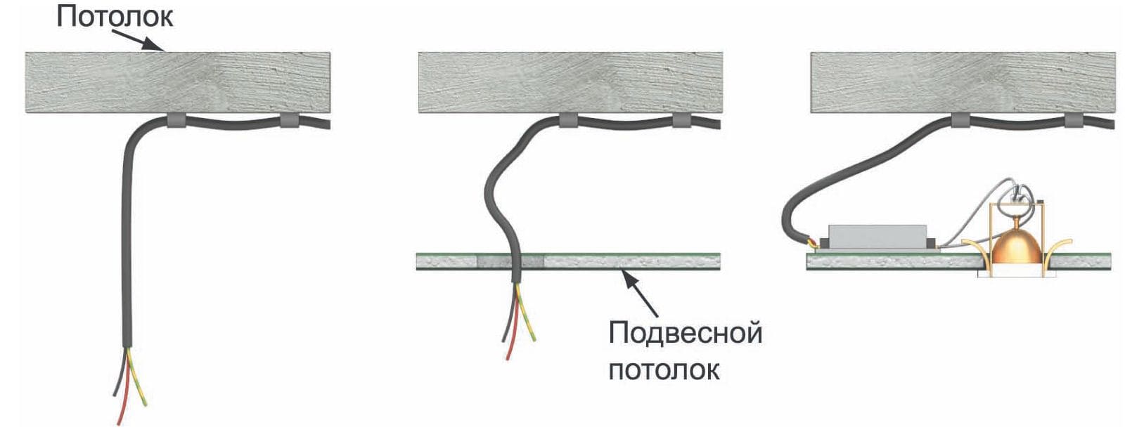Провод фиксируется на платформе Оставлять провод висящим на металлических деталях люстры или уложенным на натяжное полотно нельзя. По требованиям ТБ кабель должен быть зафиксирован на диэлектрике, а оставлять провод лежащим на натяжном полотне нельзя, это сразу будет видно по прогибу полотна.