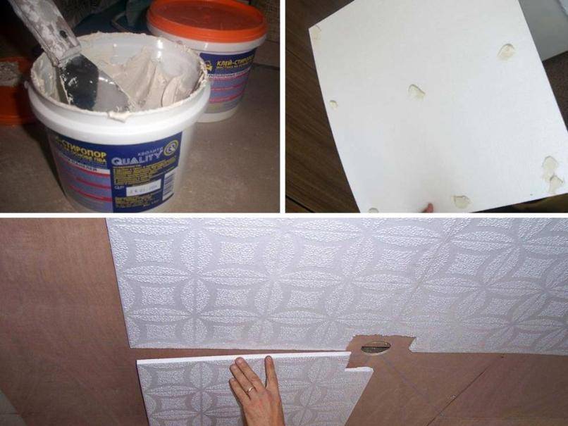 процедура начинается с середины потолка; особенно много внимания уделяется правильному приклеиванию первой плитки, так как на нее придется ориентироваться при приклеивании всех остальных элементов будущего покрытия; важно ориентироваться на ранее нанесенные линии разметки; клей может наноситься с помощью тубы или специального пистолета; если выбирается диагональный метод укладки, то плитки придется разрезать на два треугольника, причем выполнять процесс нужно только после нанесения на элементы разметки, а также для этого надо пользоваться канцелярским ножом, обеспечивающим ровные срезы; клей наносится непосредственно на плитку, поэтому распределяется по ее периметру примерно в 1 см от края, а также в центре делается клеевой крест; после нанесения клея нужно подождать примерно 1 минуту, чтобы раствор загустел и схватился, поэтому только потом плитка прикладывается к нужному участку потолка; если образуются излишки клеевого раствора, то они устраняются сухой ветошью или влажной губкой; следующие элементы приклеиваются относительно первой плитки; при необходимости крайние плитки подрезаются канцелярским ножом; в конце по всему периметру комнаты устанавливается потолочный плинтус. Во время работы в помещении не должно быть сквозняков, которые негативно сказываются на характеристиках клея
