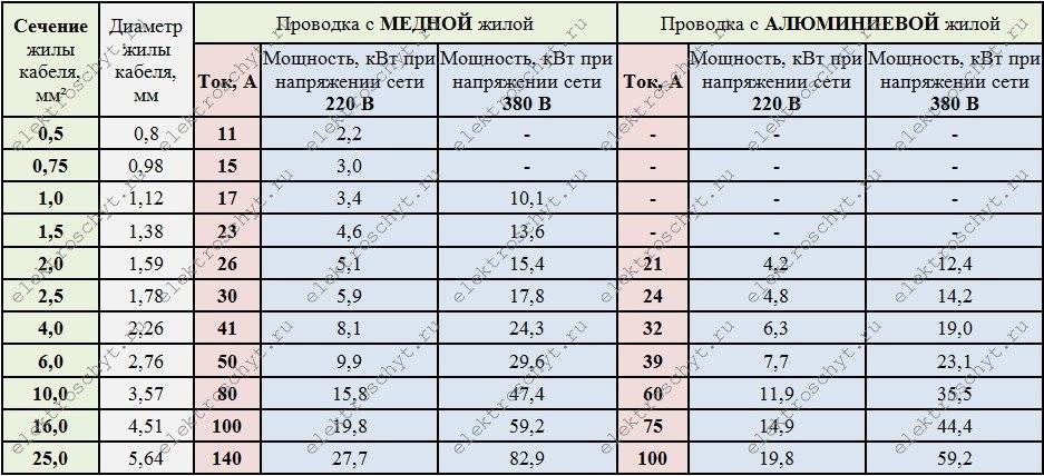 Многие электрики для «прикидки» нужного сечения считают, что 1мм² медного провода может пропустить через себя 10А электрического тока: соответственно 2,5 мм² меди способны пропустить 25А, а 4,0 мм² — 40А и т.д. Если Вы немного проанализируете таблицу выбора сечения кабеля, то увидите, что такой метод годится только для прикидки и только для кабелей сечением не выше 6,0мм².