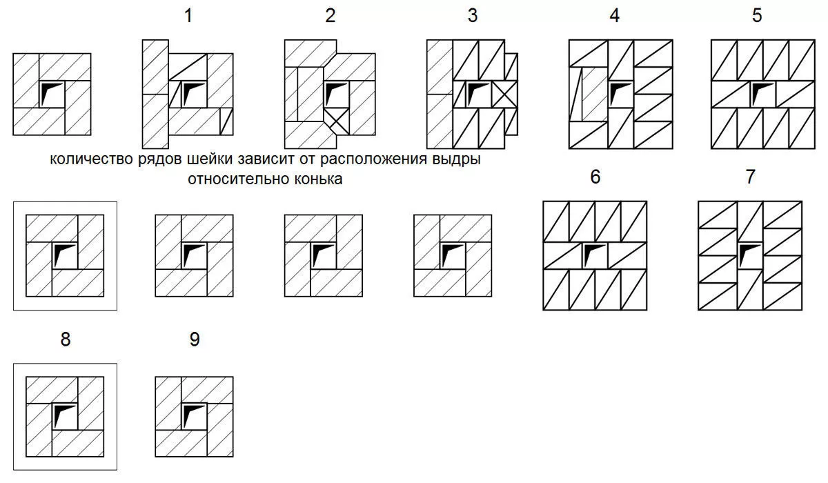 - варианты расположения оголовка относительно конька, дымовых и вентиляционных каналов внутри главной шахты;