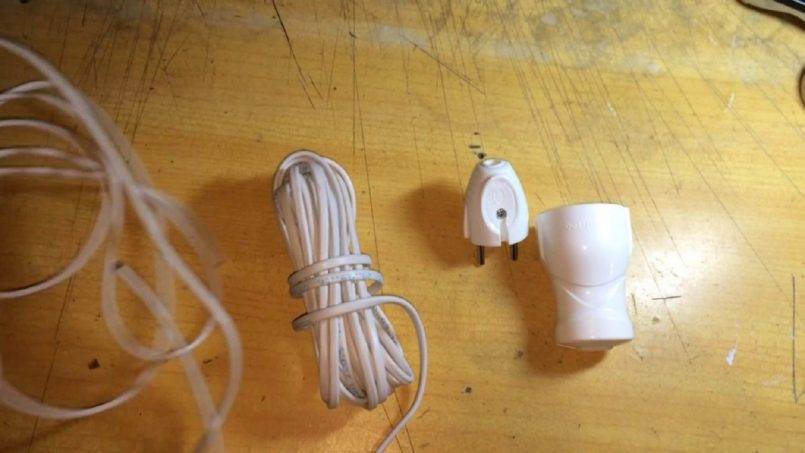 Сборку рекомендуем начать с вилки. Для этого следует удалить верхнюю изоляцию на 5-6 см. После этого очищаем сами жилы от изоляции приблизительно на 1 см. Разбираем штепсельную вилку и крепим оголенные провода непосредственно к вилке.