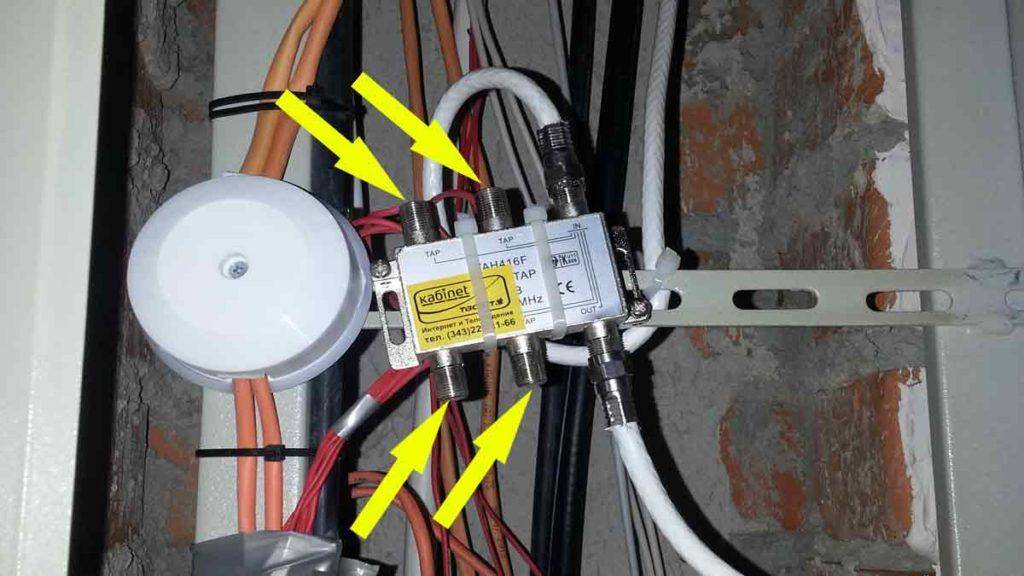 В самом начале осуществляется прокладка кабеля от коллективной антенны или магистрали кабельного телевидения, которые находятся в подъезде и на каждом этаже (часто разветвитель прячут в специальный шкафчик). При монтаже точки доступа предусматривается один вход, разъем для перехода на следующий этаж и соответствующее количеству квартир число выходов. Если в квартире индивидуальная антенна, провод подключают к ней через штекер.