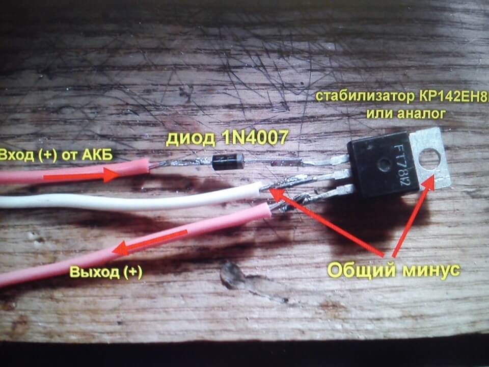 Чтобы избежать первого недостатка, схему несколько переделывают. Плюс от светодиодного модуля берут не от плюса АКБ, а через плюс замка зажигания.