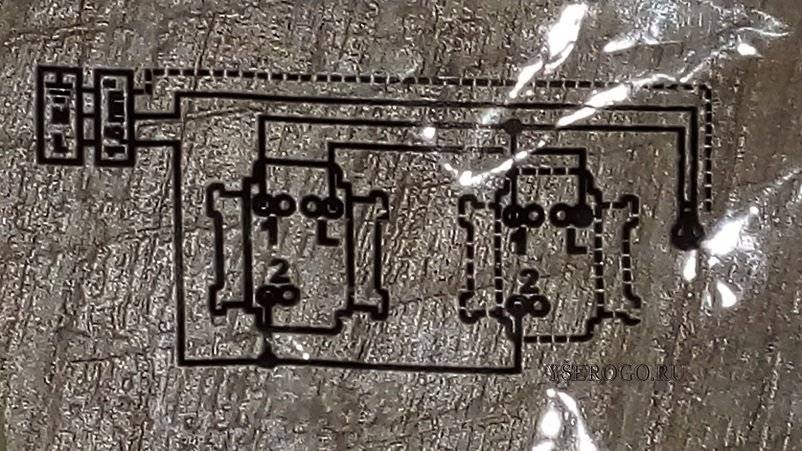 Конструкция проходного выключателя с двумя клавишами напоминает два независимых друг от друга одноклавишных выключателя, но с шестью контактами. Внешне проходной от обычного выключателя не отличить, если бы не специальное обозначение на нем.