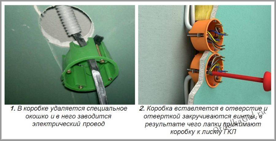 В современных изделиях уже имеется дырка, которую нужно освободить — она находится в центре стакана. Питающий кабель нужно пропустить через полученное отверстие. Если будет установлен целый блок — несколько розеток — придется соединить их специальным шлейфом. Есть два способа подключения:Различают три вида гипсокартона: обычный, влагостойкий и огнестойкий. Влагостойкий тип используется при работе в помещениях с повышенной влажностью воздуха, например, ванной комнате.