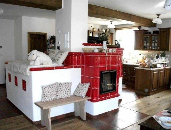 - Основанием всей конструкции служит опечек. Часто такие печи оснащают духовкой, варочной поверхностью, нишами и полочками для утвари.