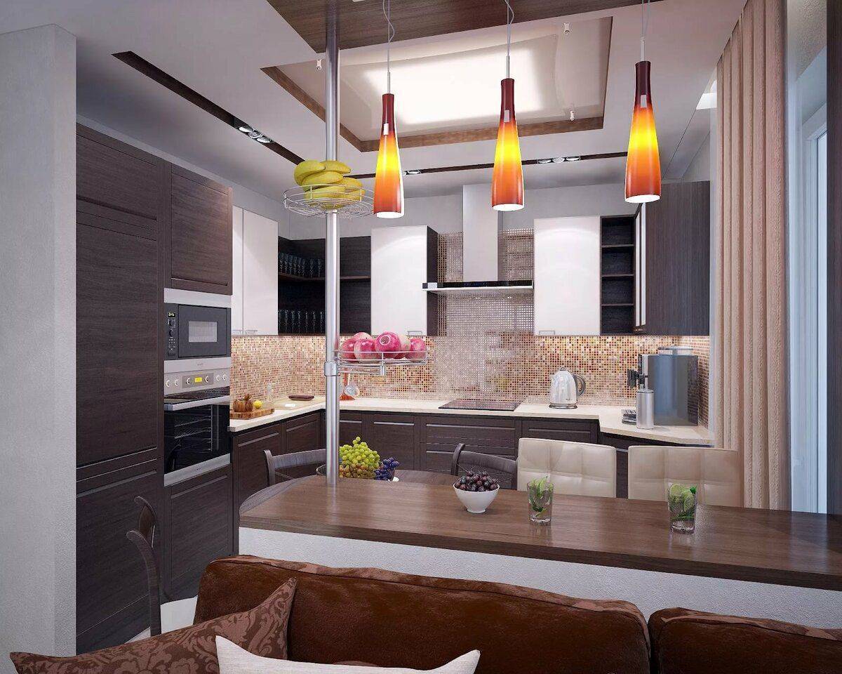 Небольшая комната имеет нюансы касательно организации освещения. Самым распространенным вариантом подсветки является подвесная люстра для кухни, оборудованная большим плафоном или абажуром. Также альтернативой становится прибор небольших размеров. Количество плафонов можно увеличить до 2 или 3.