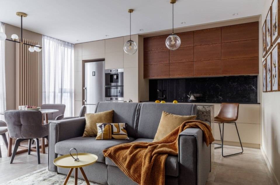 - В гостиной, совмещённой с кухней, лучше сделать два источника освещения для каждой зоны. При этом допускается использовать светильники различных размеров. Основным требованием является совместимость устройств по общему дизайну, что создаст ощущение общего помещения.