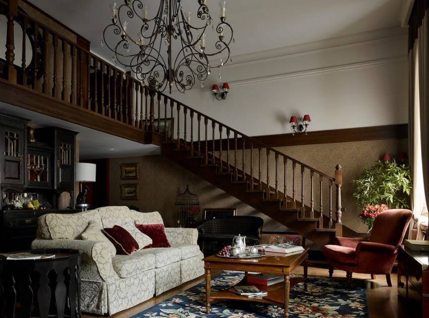 - Люстра визуально сливается с интерьером, поскольку, по замыслу дизайнера, центром внимания должен стать другой предмет: шкаф с коллекцией, богато украшенный камин и т. д.