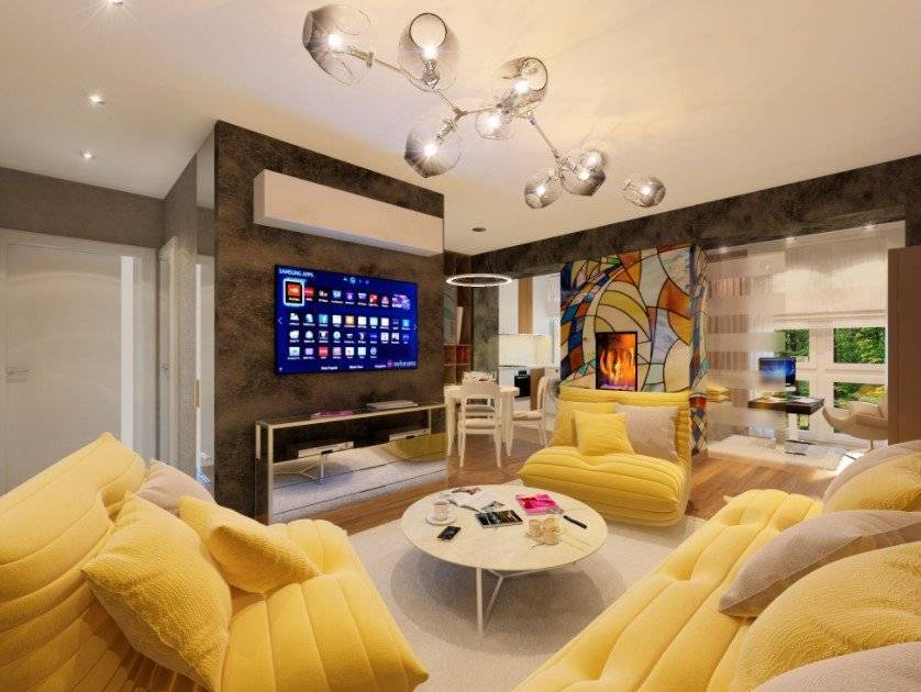 На размер люстры повлияет и форма гостиной. Если комната вытянутая и узкая, то одним из вариантов осветить ее, станет оформление двух небольших люстр. При одновременном включении гостиная заполнится равномерным светом, а если включать одни из источников, то можно выделить отдельную зону в комнате. В маленьких гостиных также лучше повесить небольшую аккуратную люстру, оснащенную светодиодными лампочками, которые наполнят комнату достаточным светом.