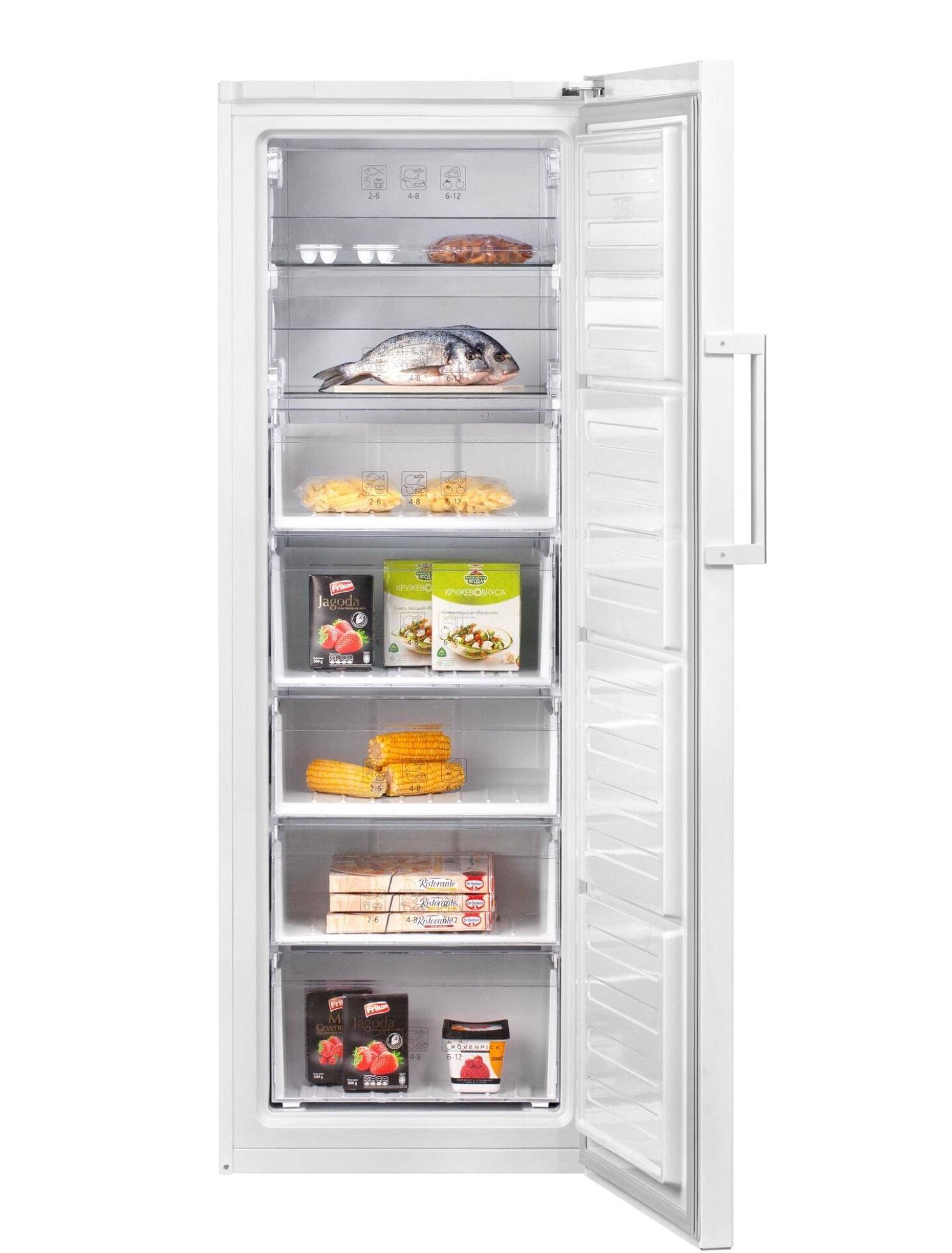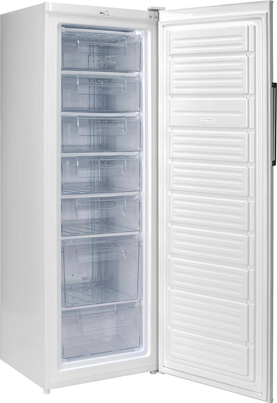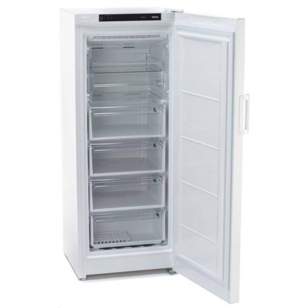 Металлический белый энергоэффективный морозильник из класса A, который потребляет 325 кВт в час за год. Один компрессор использует классический хладагент – изобутан для замораживания 225 л продуктов и заготовок. Периодически нуждается в ручной разморозке.