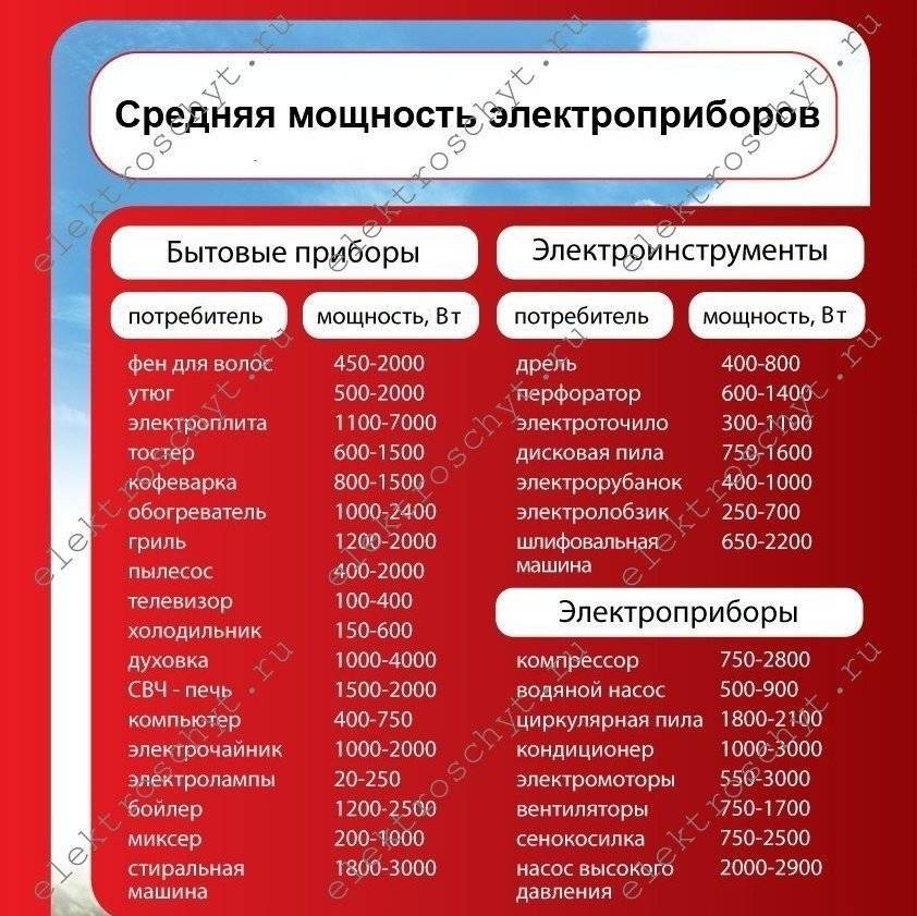 Ниже приведены средние значения мощностей, наиболее распространенных бытовых электроприемников: