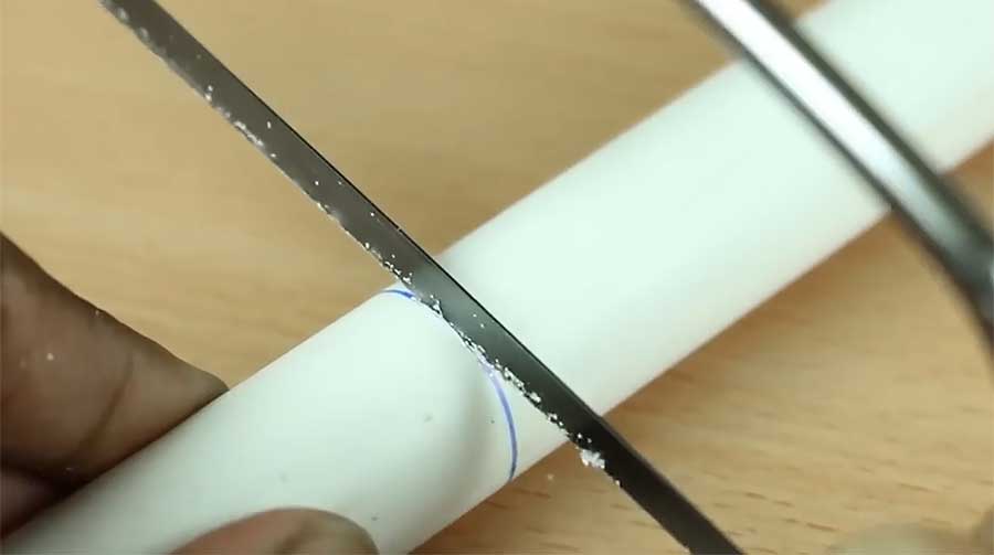 Затем отпилим ножовкой по оставленной маркером метке. Срез должен быть ровным и перпендикулярным к трубе, т. к. мы затем будем приклеивать эту трубу к доске, а сверху будет приклеен шарик.