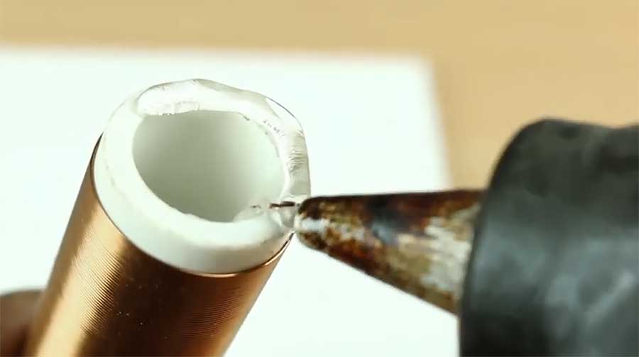 Фиксируем этот конец провода с помощью клеевого пистолета. Фиксацию производим с внутренней сторона трубы.