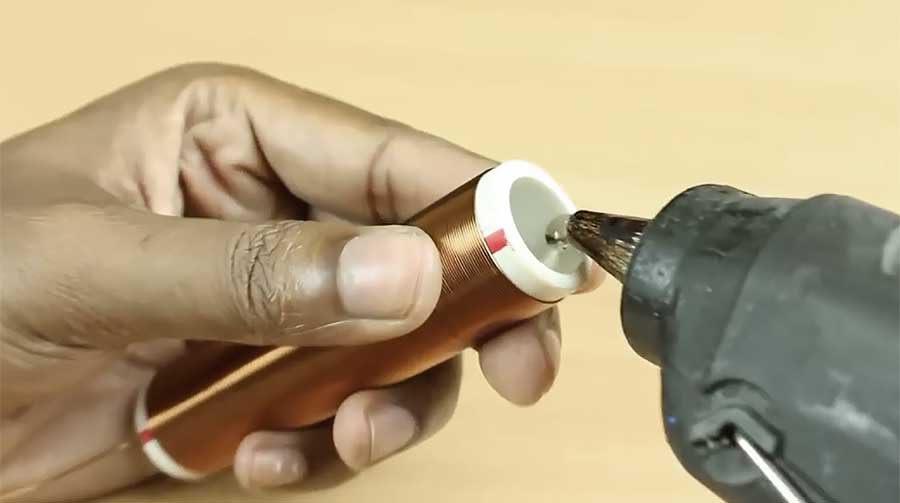 Теперь надо приклеить изготовленную катушку к основе. В качестве основы можно взять небольшую доску или кусок пластика размером 15-20 см. Для приклеивания катушки надо аккуратно намазать её торец.