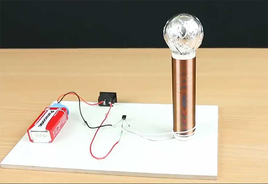Для проверки работоспособности катушки Теслы включаем питание и подносим к устройству люминесцентную лампочку – она должна светиться. Это подтверждает наличие электромагнитного поля в катушке. Если устройство не функционирует, необходимо поменять местами выводы первой обмотки, после чего проверить транзистор – возможно, он пробит.