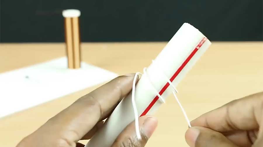 Берем ПВХ-трубу, и отрезаем кусок длиной 300 миллиметров. Наматываем на трубку медную проволоку. Если она не имеет эмалированного покрытия, после окончания работы обмотку покрывают лаком. Витки плотно прижаты друг к ругу, а концы продеты сквозь отверстия в трубе и выведены на 20 мм. каждый. Контакты делают сверху. Основанием послужит конструкция из ДСП. Диэлектрическая платформа должна быть устойчивой. Поэтому лучше сделать ее шире, чем диаметр элементов, размещаемых на опоре. Первичная обмотка – это обычно три с половиной витка. Материал – медная трубка