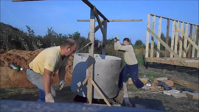 После копки котлована приступают к монтажу бетонных колец, установленных друг на друга при помощи грузоподъемной техники. Алгоритм проводимых манипуляций следующий: