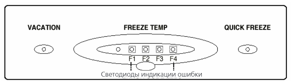 - F2 (третий сверху светодиод) — неисправность верхнего датчика холодильного отсека. С десятиминутными интервалами открывается и закрывается клапан.