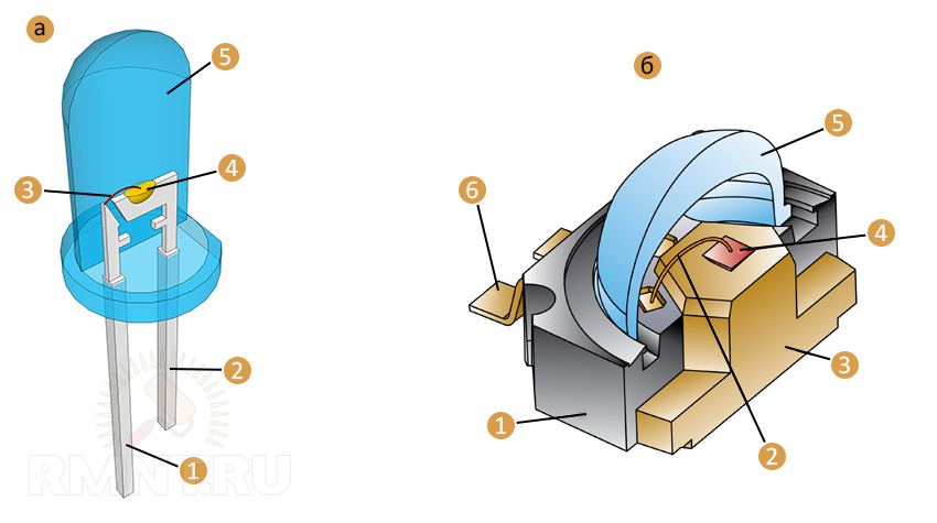 а) конструкция обычного светодиода: 1 — анод; 2 — катод; 3 — проводник; 4 — кристалл; 5 — пластиковая линза