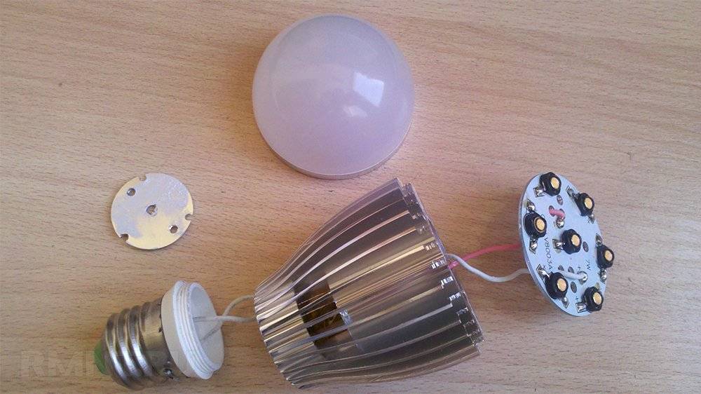 Конструкция данной лампочки состоит из следующих элементов: рассеивателя, светодиодов, монтажной платы, радиатора, блока питания, корпуса и цоколя. Последний элемент может иметь два типоразмера патрона: Е14 (маленький) и Е27 (большой).