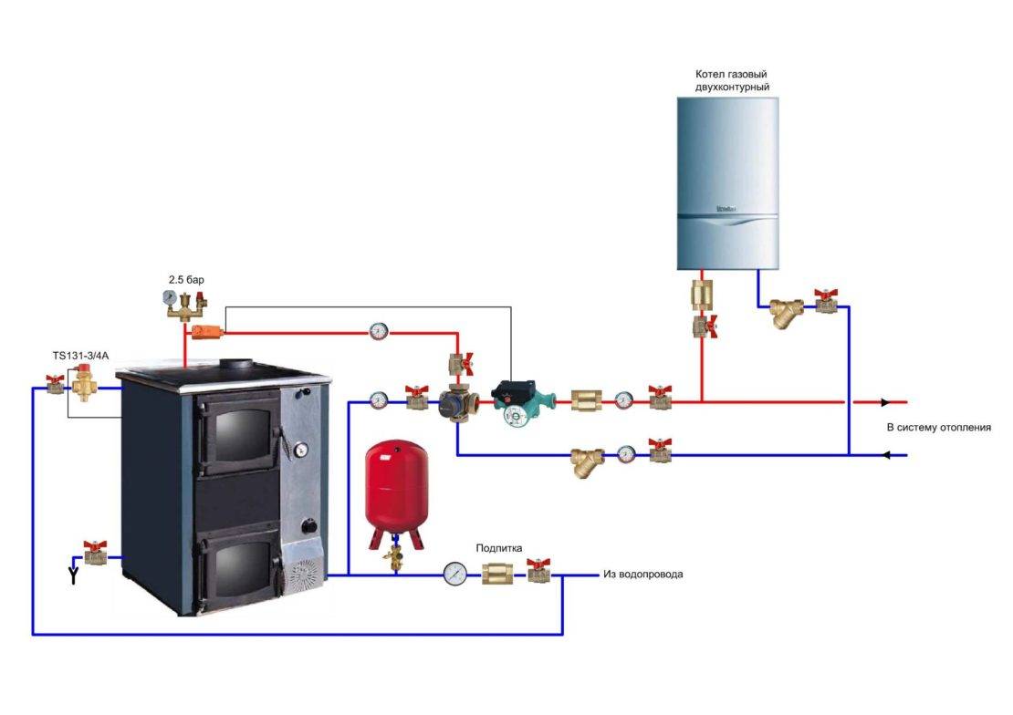 Очень экономичная схема с раздельными топками и двумя теплообменниками. Для нее потребуется специальное разрешение от газовой инспекции, поскольку конструкция твердотопливной части, не должна ухудшать работу газовой системы.