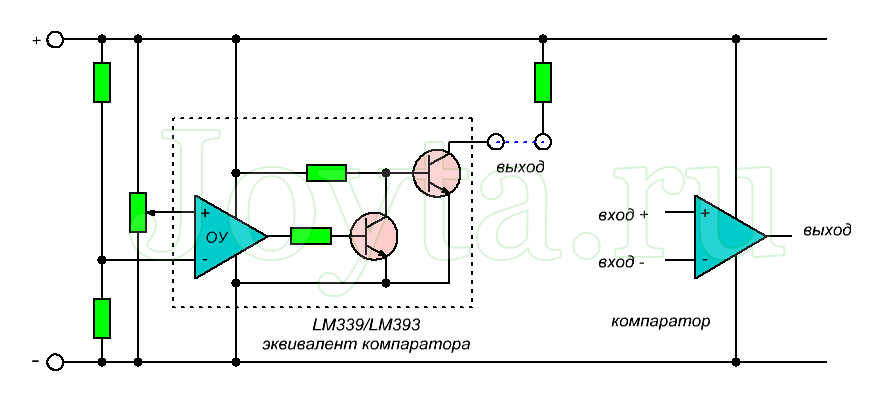 Выходные каскады компараторов рассчитаны таким образом, чтобы их выходное напряжение соответствовало бы входному логическому уровню многих цифровых микросхем, поэтому их ещё могу называть формирователями.