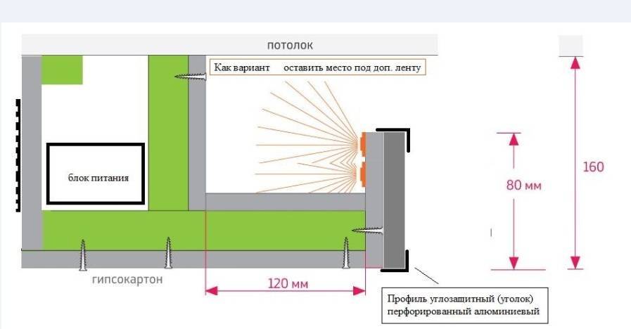 Это будет служить основой для крепления полоски гипсокартона, а сверху будет монтироваться светодиодная лента.