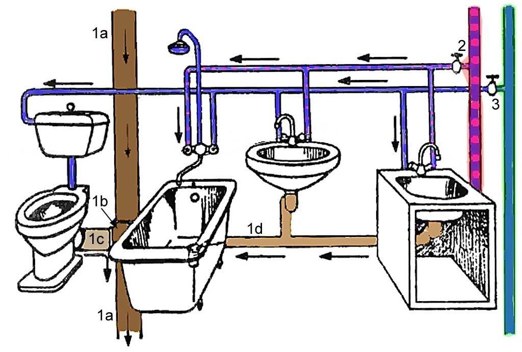 С учетом того, что все сантехнические приборы – унитаз, раковина в ванной комнате, ванна (душевая кабинка), мойка на кухне – должны снабжаться водой и обеспечиваться путем слива использованной жидкости, эти приборы стараются размещать на «одной линии» и, соответственно, трубы прокладываются вдоль одной стены.