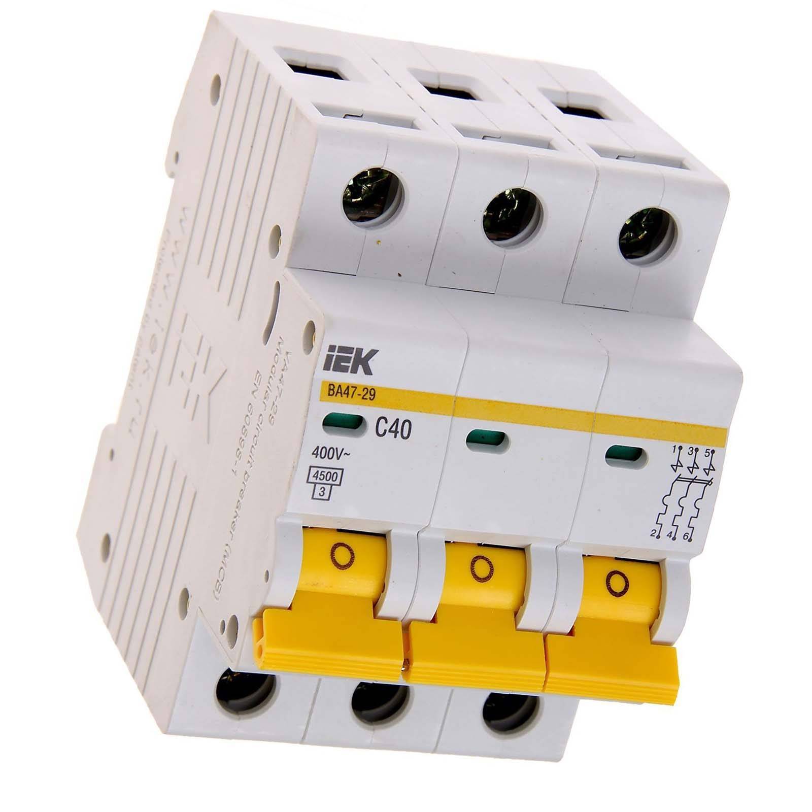 Более сложную конструкцию имеют автоматические выключатели, оснащенные электромагнитными и/или тепловыми датчиками. Ниже на фото однофазный автоматический выключатель, а справа – трехфазный