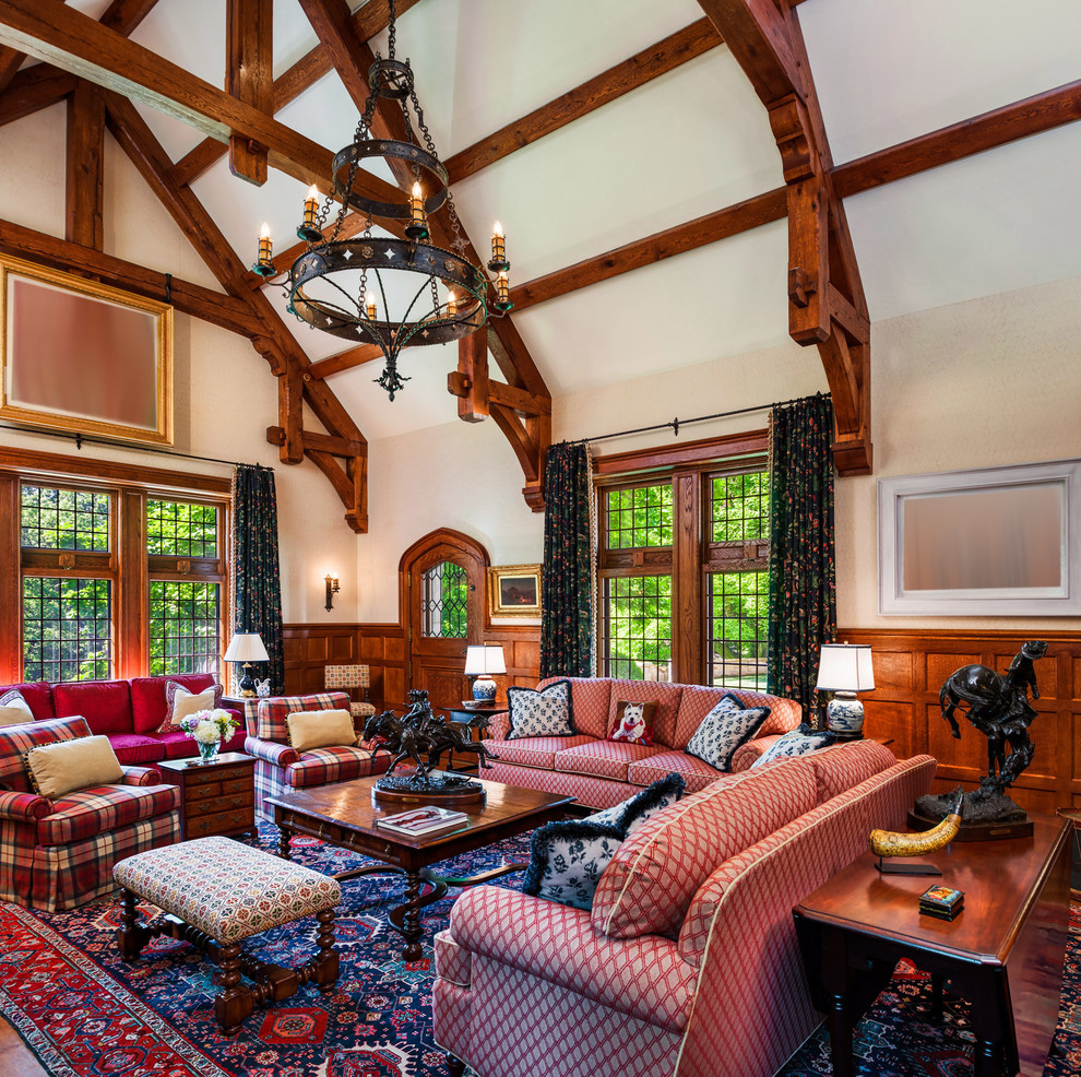 Для загородных резиденций в стиле охотничьих домиков принято сооружать массивные металлические светильники из комбинации с деревянными брусками.