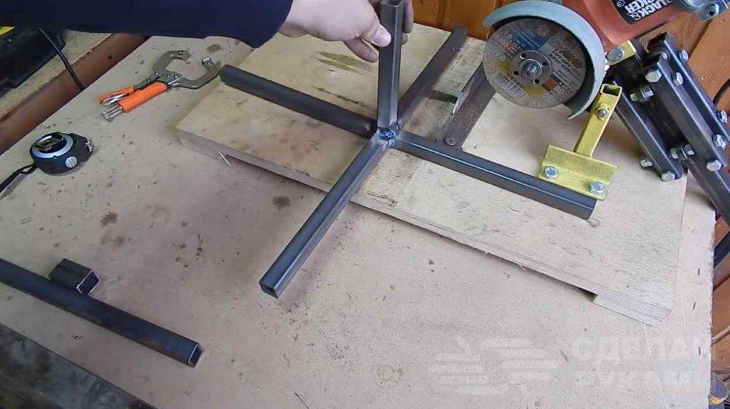 На нижнем конце большой вертикальной трубки приварил мебельные уголки и развернул их примерно на 120 градусов относительно друг друга.