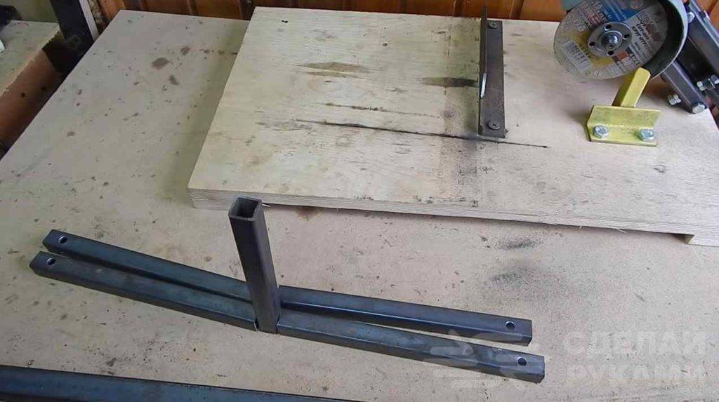 Следующим этапом стало изготовление ножек. Они по сути были уже готовы. Одну из двух трубок я разрезал болгаркой пополам, а от второй отрезал половину. Вышло три ножки длиной 27,5 см.