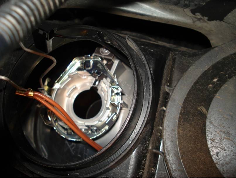- Извлечение старой лампы. Чтобы установить «ксенонки», нужно из фар сперва извлечь старые галогенные лампы. Для этого снимите пластиковый защитный колпачок, закрывающий цоколь с обратной стороны фары, и, отжав металлический зажим, извлеките прежнюю лампочку из гнезда.