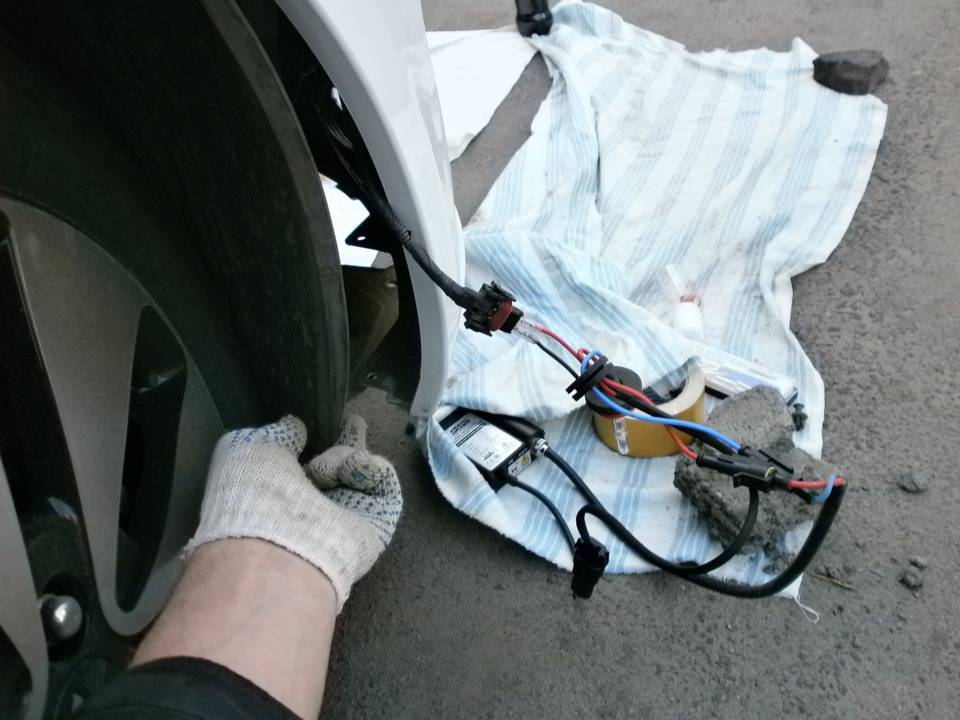 Зачастую противотуманные фары находятся под главным светом, поэтому для их установки сначала необходимо снять бампер. Можно просто открутить болты, которые крепят арки передних колес и боковые стороны бампера.  Далее отключаем штатные противотуманки от питания, достаем старые лампочки и вставляем ксеноновые. Помните о том, что нельзя касаться колбы ксеноновой лампы руками (можно использовать перчатки). После этого подключаем ксеноновую лампу к питанию противотуманок и к блоку розжига.