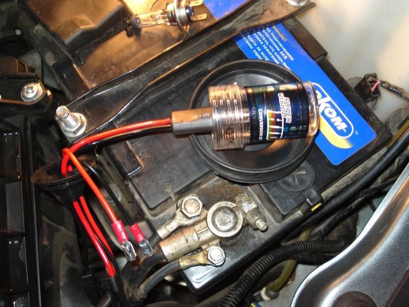 Ксеноновая лампа устанавливается на место, проводка пропускается сквозь крышку. Аккумуляторную батарею лучше снять, так как она будет создавать помехи в работе.
