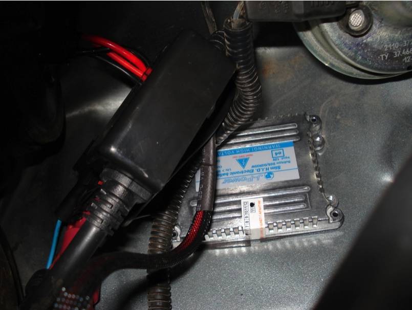 Затем монтируется блок розжига. Для предотвращения натяжения проводки его лучше разместить поблизости от фар в месте, куда не проникают влага и загрязнения. Для дополнительной защиты этот узел следует обернуть скотчем или изоляционной лентой.