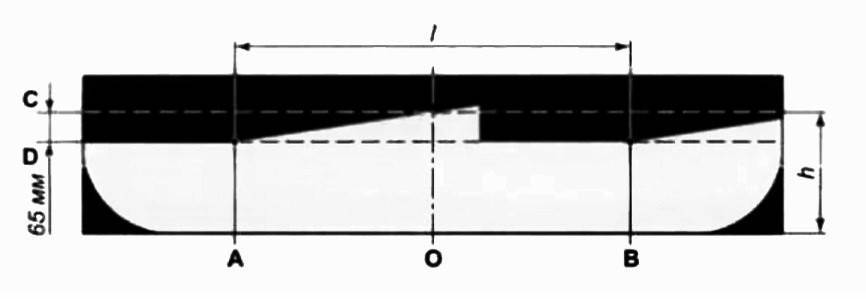 - две горизонтальные линии. Между ними расстояние 65 мм. Верхняя линия (на рисунке — С) обозначает высоту оси ближнего света над землей, нижняя (D) — граница основного пучка света.