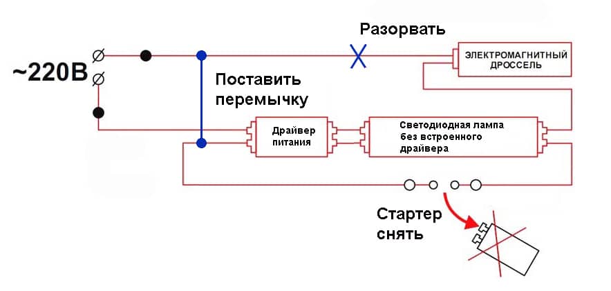 Необходимо произвести извлечение стартера из люминесцентного светильника и закоротить дроссель. Это необходимо для подачи нужного напряжения в светодиодной лампе.