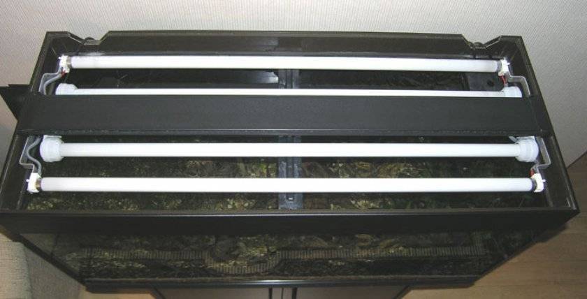 Существует два варианта такого расположения: открытый и закрытый. Светильник первого типа висит над аквариумом. Светильник второго – монтируется в крышку емкости. Второй вариант дешевле и проще в эксплуатации.